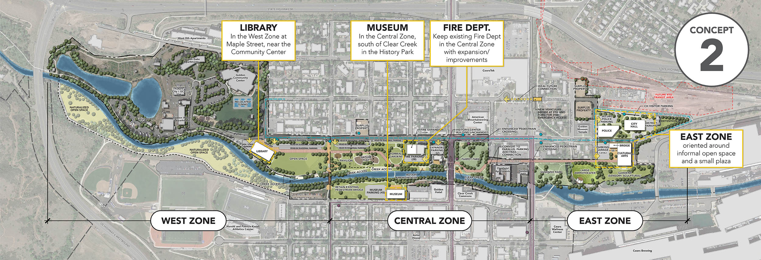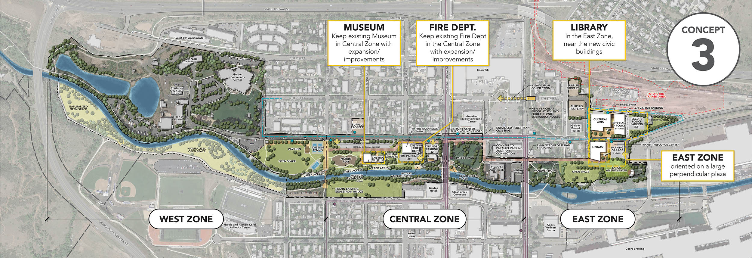 The plan aligns with what the community envisioned for the Clear Creek Corridor, which started in 2011 with the Clear Creek Corridor Master Plan. That plan suggested moving several city facilities east of the Clear Creek Corridor on property purchased in 2019 to create more open space and community amenities in the Heart of Golden area.
